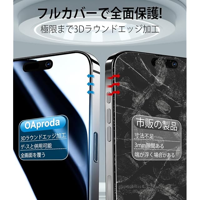 【強化黒縁・1枚が3枚に匹敵】 いphone16 ガラスフィルムは、硬度9Hを超える強化ガラスを採用し、極細黒縁は曲線に沿って全画面をカバーします。強化設計により落下や衝撃によるフチ割れや損傷を全力防ぎます。OAproda製の保護フィルム、1枚で3枚分に匹敵する卓越した耐衝撃性と耐傷性を持ち、スクリーン保護と絶対的な安心感を提供します。