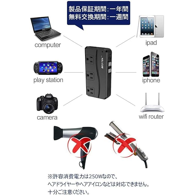 【ポータブル】コンパクトで、従来品に比べて軽いです。コードも取り外し可能で出張や海外に持って行かれる方には最適です。 ※ヘアドライヤーは使用できません。 ※ヘアアイロンなどは消費電力を十分ご確認した上でご使用下さいませ。
