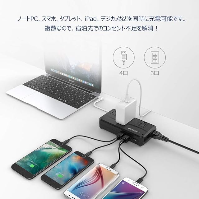 【大容量】定格250W、ACコンセント3口とUSB4ポートを搭載して、ノートPC、スマホ、タブレット、iPhone、iPad、デジカメなどが同時に充電可能で、宿泊先でのコンセント不足を解消できます。
