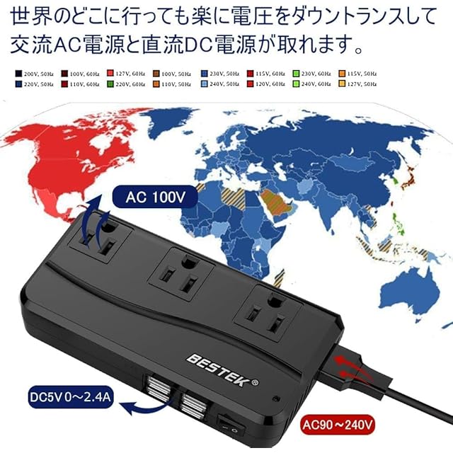 【海外対応】本製品には変圧機能を搭載して、マルチ変換プラグが付き、90V~240Vを100Vに変換して、海外でも日本の家電製品が使えます。 ※ 変換プラグの接続口に正しく接続するようにご注意ください。