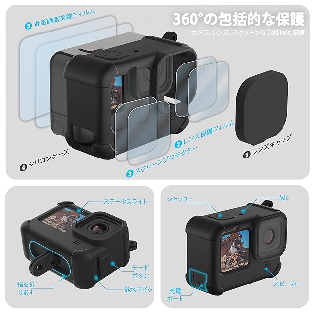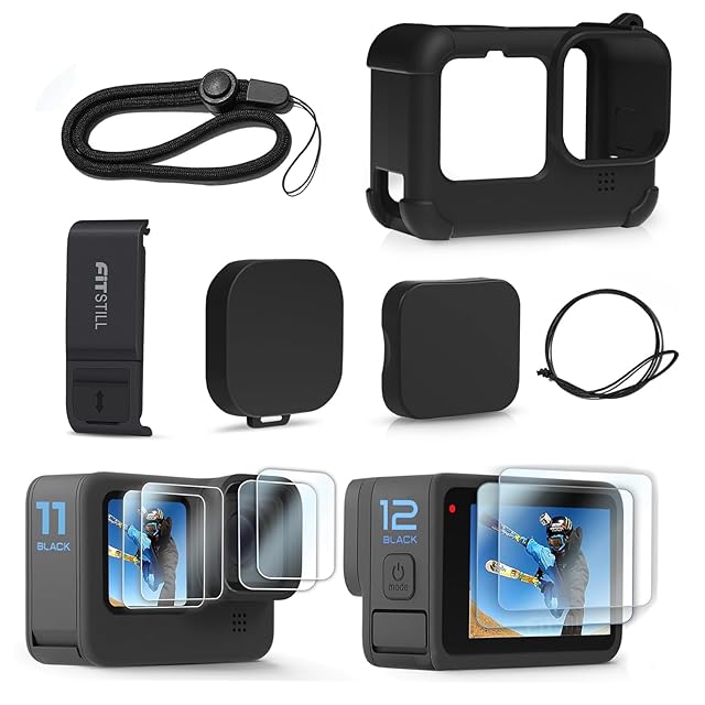 FitStill HERO12 Black /11 Black /10 Black / HERO9 Blackに使用 ラアクセサリー用の(保護フィルム+電池カバー+ ブラックシリコンケース+レンズカバー+ハンドストラップ)(ゴープロ GO PRO HERO 12 / 11 / 10 / 9 Blackに適合) | TREND DESIGN 家電専門店