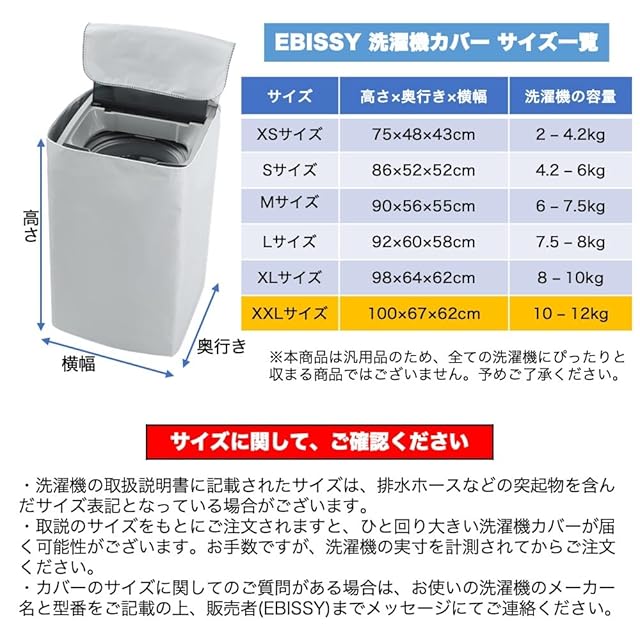 仕様 : ファスナー(ジッパー)開閉式 4面すっぽり囲い / XXLサイズ : (約) 高さ100cm×奥行き67cm×横幅62cm / 洗濯機の容量 : 7.5-8kg