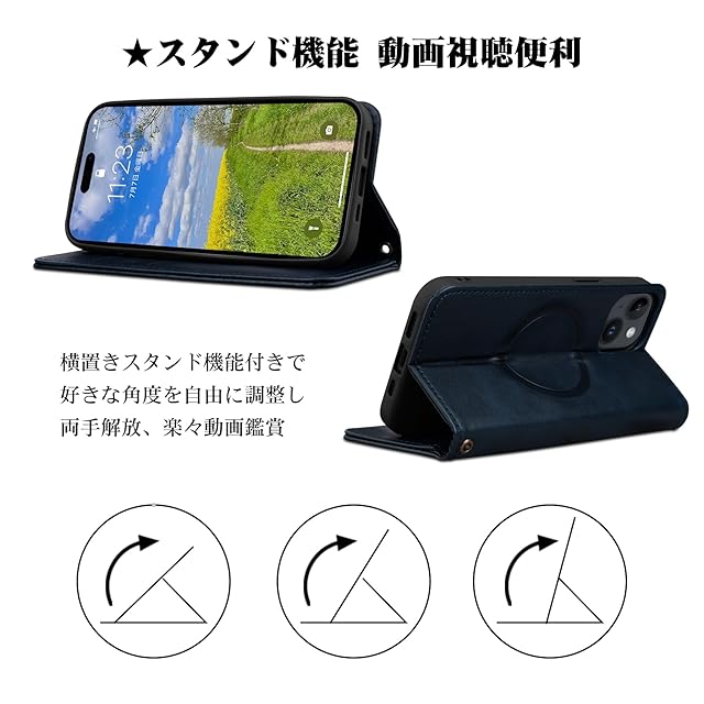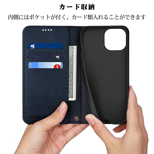 カード収納:iPhone 15 専用 手帳型ケースの内側にカードポケットがあり、定期券や、カード、名刺など収納可能です。日常の生活に便利です。ご注意:携帯本体に影響を及ぼす恐れがあるため、弱い内蔵マグネットを使用しています。カードを入れるとマグネットが効かない場合があります。