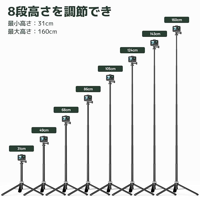 延長自撮り棒は8つの異なる長さに延長でき、31CMから160CMまで素早く長さを調整できます。