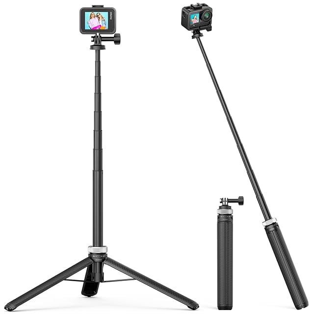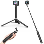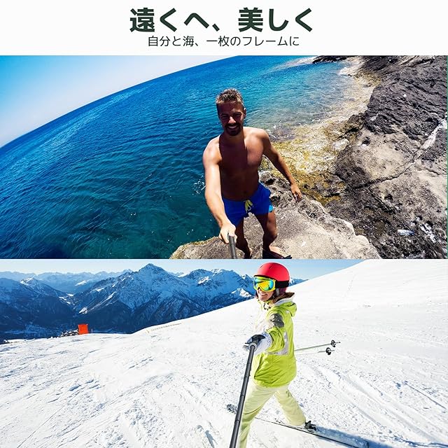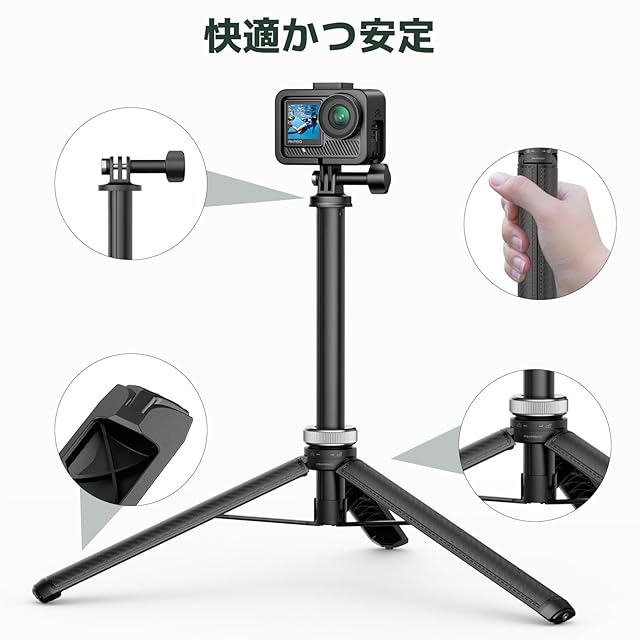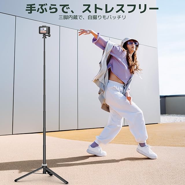 三脚+自撮り棒を一体化した設計を採用し、自撮り棒だけでなく、アクションカメラ用の三脚としても使えます。 自撮り棒と三脚の機能を統合したデザインで、延長棒と三脚モードを自由に切り替えることができます。