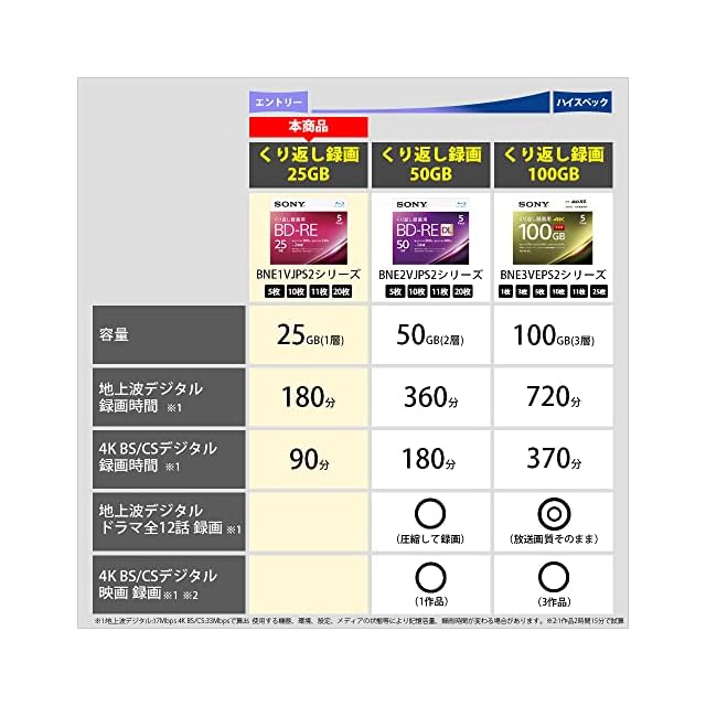 記憶容量:25GB(1層)/1枚、記録時間:180分(HD画質:DRモード)