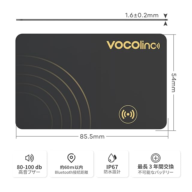 【技術仕様】:カード型(1.6mm)、薄くて軽いので収納に便利です。 防水(IP67等級)。内蔵バッテリーの寿命は3年で、安全、耐久性。