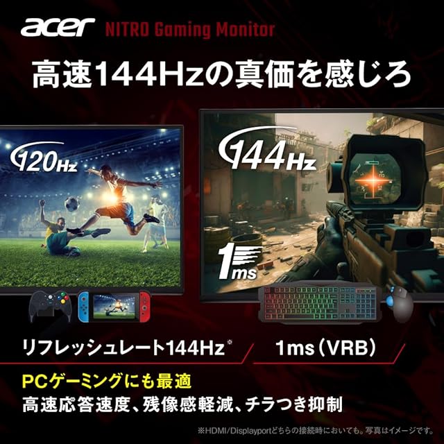 商品名:Acer 23.8インチ フルHD 144Hz 1ms(VRB) IPS 非光沢 sRGB 99% AMD FreeSync ブラックブースト VRB対応 ブルーライト低減 HDMI 1.4 DisplayPort v1.2 スピーカー・ヘッドホン端子 Acer Display Widget 6軸カラー調整 VESAマウント対応 Nitro ゲーミングモニター QG241YP6bmipx