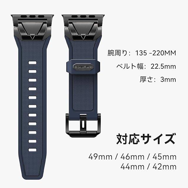 SUNFWR アップルウォッチ バンドは、コンパチブルApple Watch Ultra 2/1・Series 10~1・SE2/SE、手首135~220mmに柔軟フィット。TPUを超える肌馴染みを実現した高純度液体シリコンを採用し、低刺激設計で敏感肌でも安心。耐汗・耐摩擦性に優れ変色・硬化ゼロの耐久性に加え、環境配慮型素材で環境ホルモン不含。スポーティで洗練されたデザインはステンレスアダプターの確固たる固定性と通気孔構造を融合、ビジネスからアウトドアまで24時間快適に装着可能。工具不要3秒着脱&軽量柔軟性で日常から激しい運動シーンまで対応。12ヶ月+24時間サポート付きで、機能性とスタイルを兼ね備えた次世代バンドです。