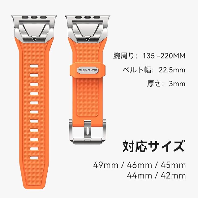 SUNFWR アップルウォッチ バンドは、コンパチブルApple Watch Ultra 2/1・Series 10~1・SE2/SE、手首135~220mmに柔軟フィット。TPUを超える肌馴染みを実現した高純度液体シリコンを採用し、低刺激設計で敏感肌でも安心。耐汗・耐摩擦性に優れ変色・硬化ゼロの耐久性に加え、環境配慮型素材で環境ホルモン不含。スポーティで洗練されたデザインはステンレスアダプターの確固たる固定性と通気孔構造を融合、ビジネスからアウトドアまで24時間快適に装着可能。工具不要3秒着脱&軽量柔軟性で日常から激しい運動シーンまで対応。12ヶ月+24時間サポート付きで、機能性とスタイルを兼ね備えた次世代バンドです。