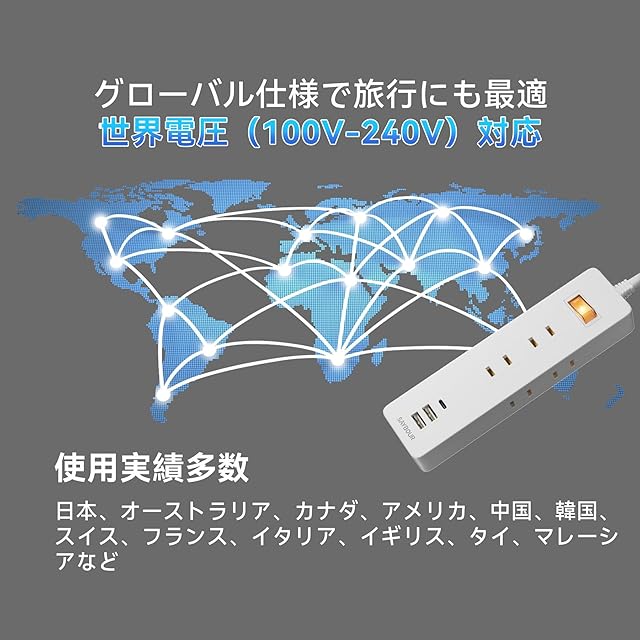 「海外でも使用できるグローバル仕様」広範囲電圧技術により、国内はもちろん、世界中どの国の電圧でも対応。国内外の旅行や出張に。※製品には電気安全法に則して国内家庭用電源の定格電圧「100V」と記載しています。実際には、100V〜240Vの範囲で安全に使用することができます。電源タップとしては変圧器不要ですが、変圧機能はございません。接続する製品の使用可能電圧を必ずご確認の上ご使用ください。
