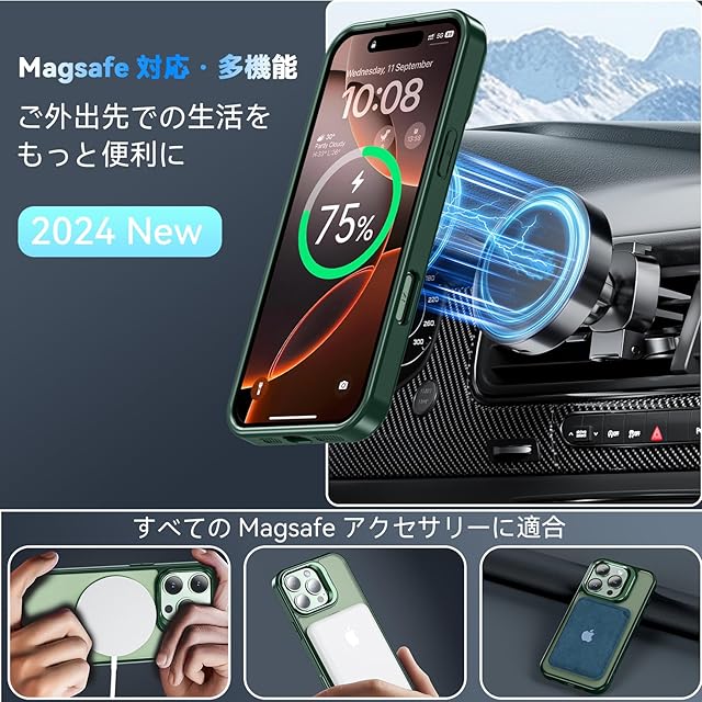 【MagSafe対応&スタンド機能】ケース内部には2024年に新開発された強力なマグネットが搭載されており、吸着力と安定性が向上し、MagSafe充電対応で差し込みのいらない超簡単・超高速充電を実現しています。MagSafe対応アクセサリーもいろいろな iPhone 16 Pro Max ケース!また、カメラの外枠は頑丈なアルミニウム合金材料を用いて開閉しやすい支持枠を作り、スタンドの機能を与え、お好きな角度を調整でき、両手が解放され、いつでもどこでも動画視聴便利です。