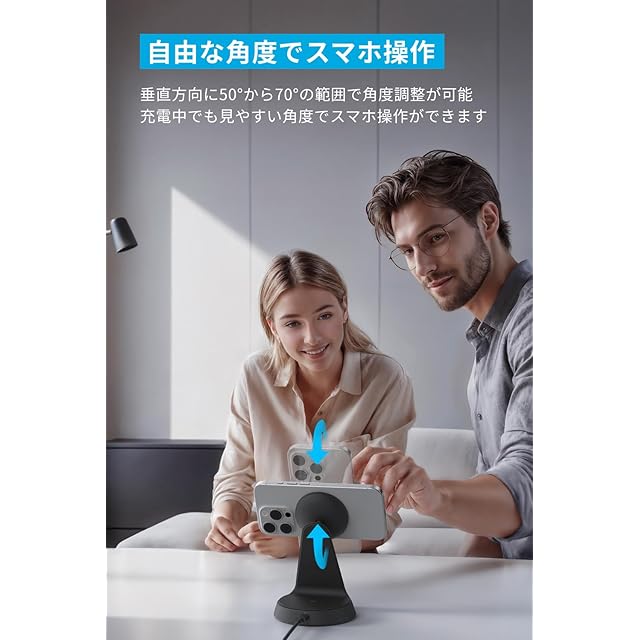 自由な角度でスマホ操作:垂直方向に50°から70°の範囲で角度調整が可能。充電中でも見やすい角度でスマホ操作ができます。