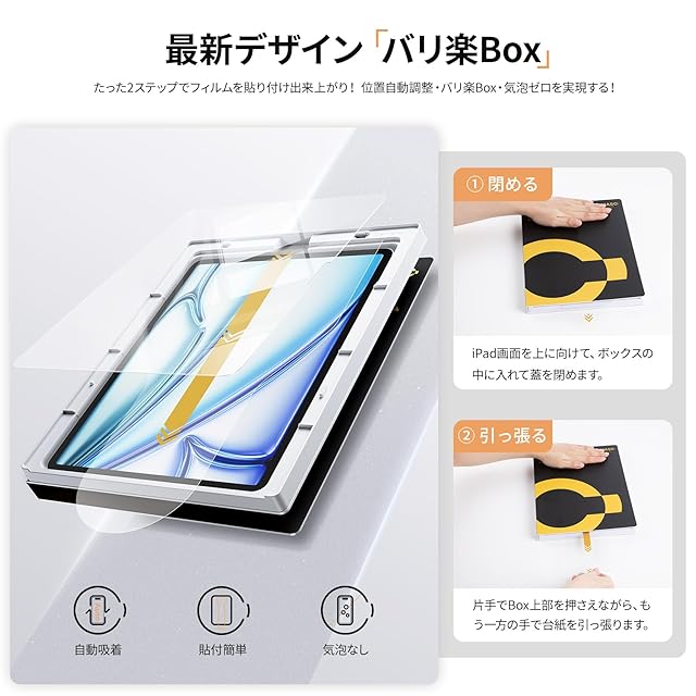 誰でも簡単に貼れる:NIMASO最新デザインの自動除塵セットは、他の補助工具を必要とせず、引っ張るだけで貼り付けが完了します。自動除塵セットには正確な位置決め装置が搭載されており、iPad Air 11の画面にぴったり合うようにフィルムが配置されています。これにより、貼り付け時に自動的に位置調整が可能になり、効率的で精度のよい貼り付けが可能になりました。フィルムを貼るのが苦手な方でも簡単にフィルムが貼ることができます、「誰でも簡単に貼れる」を実現します。