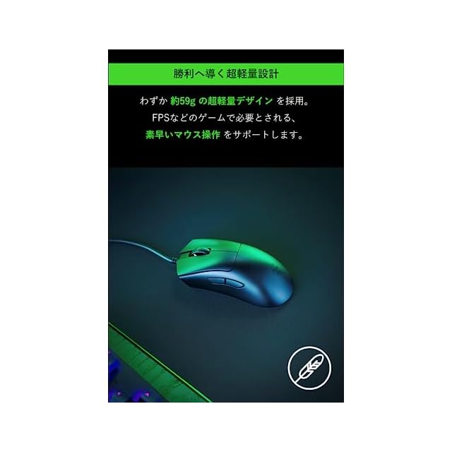 【59gの超軽量デザイン】前モデルのRazer DeathAdder V2よりも 約30%軽量化。表面に穴をあける事無く極限まで最適化された本体重量は確かな剛性と共に、59gの軽量化を達成。正確かつ、高速なマウス操作を実現可能な本体設計となっています。