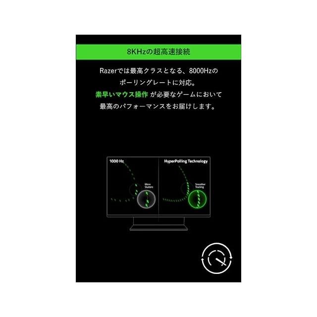 【Razer 8,000Hz HyperPolling 技術】毎秒最大8,000回の操作情報(マウスを動かした際のセンサーの読み取り量やクリック信号など)をPCに伝達でき、驚異的な反応速度と精度でのマウス操作を発揮できます。ゲームユーザーの能力を引き出して、FPS等のゲームを有利に進められます。