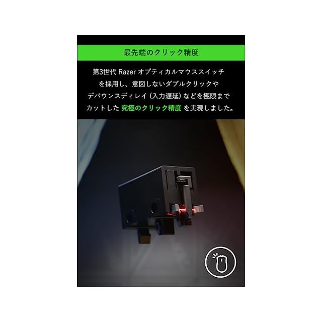 【第3世代Razerオプティカルマウススイッチ】ダブルクリックの問題を排除しながら、耐クリック回数を9,000万回に改善し、デバウンスディレイなしのわずか 0.2msのアクチュエーションを備えたこのマウスは、eスポーツ向けに設計された信頼性とスピードを発揮します。