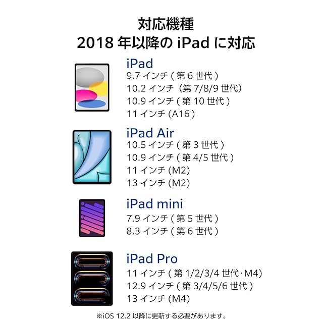 対応機種: 2018年以降のiPadに対応(一部機種を除く) ※iOS 12.2以降に更新する必要があります。※2018年以前発売のiPadには対応しません。※2025年5月現在。