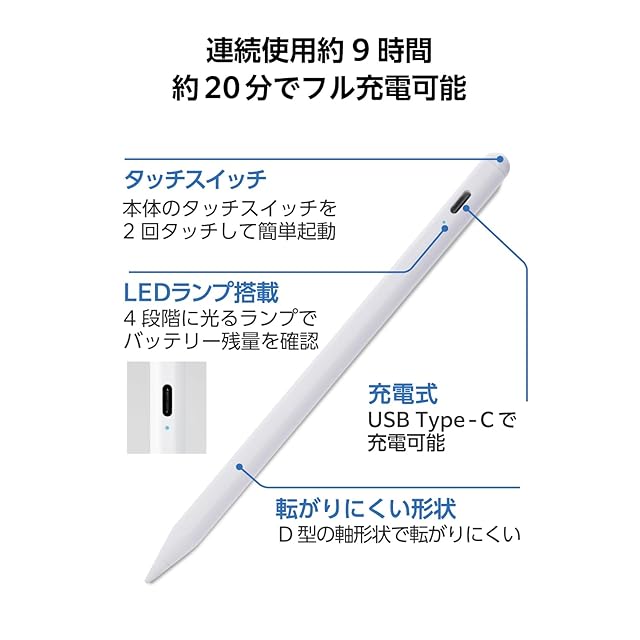 商品名:エレコム タッチペン 【iPad 7/8/9/10、 11インチ(A16)、Pro 11/12.9/13インチ、 Air3/4/5/11・13インチ、 mini5/6に対応】 iPad専用ペンシル 急速充電 パームリジェクション 傾き検知 20分でフル充電 磁気吸着 USB-C充電 ホワイト P-TPACSTAP09WWH