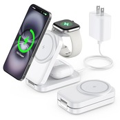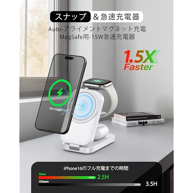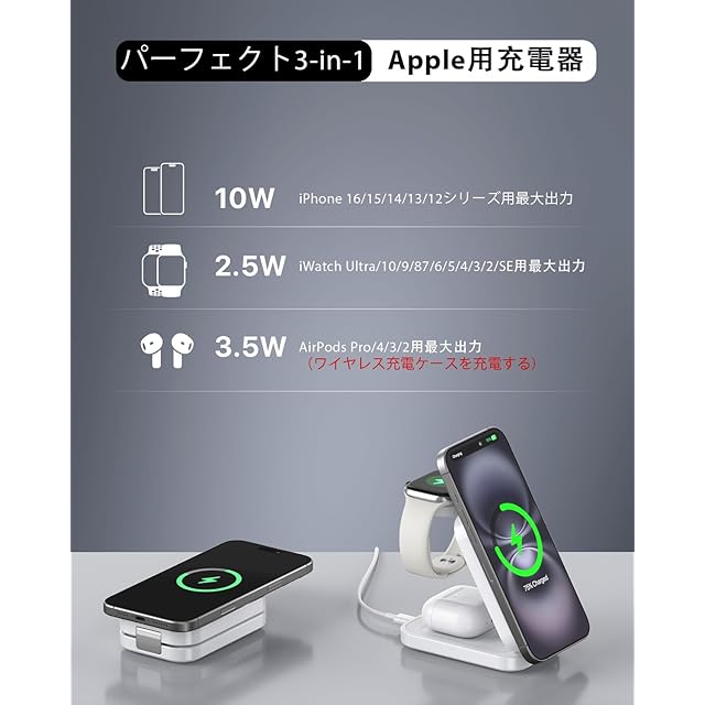 商品名:3in1 magsafe充電器 折り畳み式 超コンパクト ワイヤレス 高速充電 2.5-10W出力 スタンド iPhone 16/15/14/13/12シリーズ/Airpods 2/3/pro/Apple Watchに対応 軽量 出張/旅行用 マグネット充電器 20WQC3.0アダプタ付属 日本語取扱書付き ホワイト