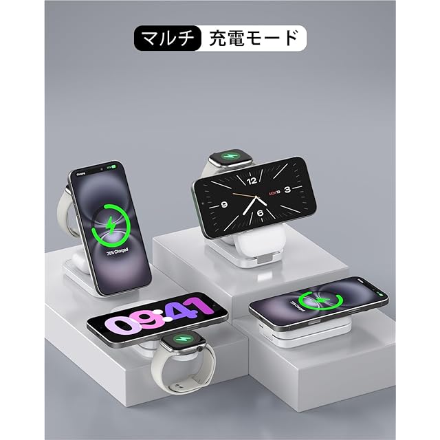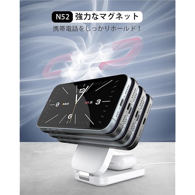 【幅広い互換性&パッケージ内容】iPhone16/15/14/13/12/シリーズ(magsafeケースを使用してください)。【ご注意】:airpodsの場合、magsafe充電ケースが対応するが、Lightning充電ケースが対応しない。※ スマートウォッチはiWatchのみ対応。パッケージ内:ワイヤレス充電器本体×1、20W PD3.0アダプター×1、USBC-Cケーブル×1、日本語取扱説明書×1。