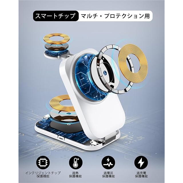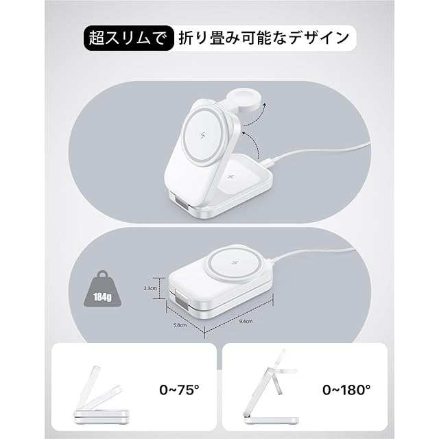 【3in1&折り畳み式】ワイヤレス充電器はiPhone、Apple Watch、AirPodsを同時に充電可能!外出先でも充電器1つあればOK、コードの煩わしさから解放されます。複数の充電ケーブルを持ち運ぶ手間が省け、よりすっきり便利です。超軽量・コンパクトmagsafe充電器、折り畳みサイズ約60*23*95mm、重さ:約184g。折りたたむと携帯電話の半分の大きさになります。 旅行、出張に最適。スリムな折りたたみデザインでバッグやポケットに収納可能。開閉部は5,000回の耐久テストをクリアした頑丈なヒンジ採用で、長期間安心してご利用いただけます。
