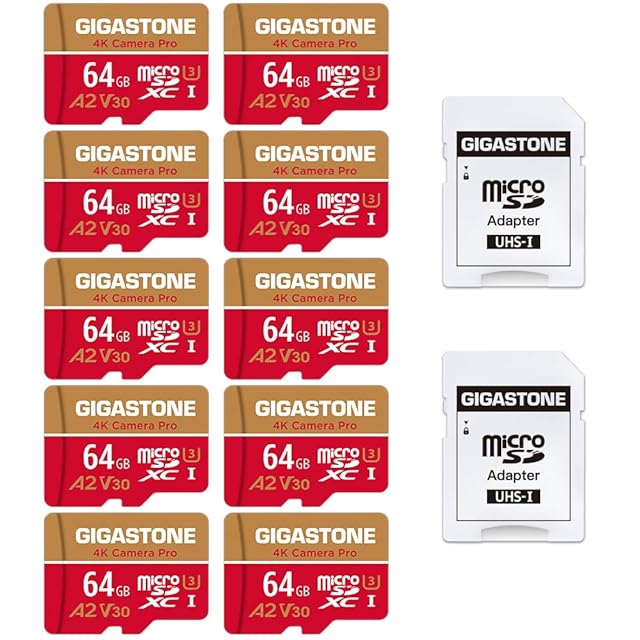 商品名:【5年 】Gigastone マイクロSDカード 64GB A2 V30 10個セット SDアダプタ付き UHD 4K ビデオ録画 4K動作確認済 95MB/s マイクロSDXC UHS-I U3 Class 10
