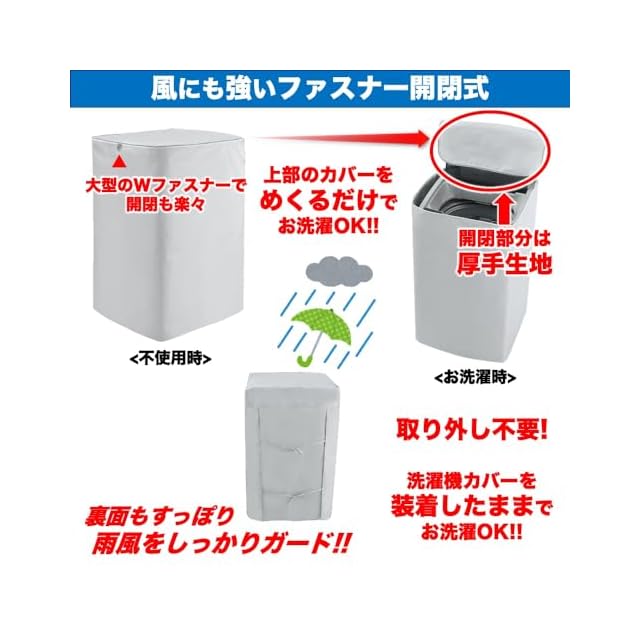 全自動洗濯機を紫外線や雨、雪、ホコリなどからしっかり守る防水加工済(生活防水)の4面すっぽり仕様の洗濯機カバーです。表面にシルバーコーティングを施しておりますので、紫外線に強い商品となっております。 洗濯機カバー上部の開閉部分は、厚手生地(表面:シルバーコーティング/裏面:PVCコーティング)を採用し、より丈夫な洗濯機カバーに仕上げました。 給水ホースを脱着し、カバーを洗濯機の上から被せて、本体背面のひもを結ぶだけで簡単に装着できます。