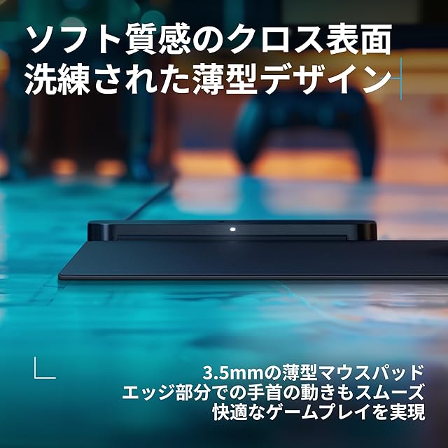 洗練されたスリムデザインを採用/3.5mmの薄型マウスパッドにはソフトな質感のクロス素材を採用/エッジ部分での手首の動きもスムーズで、快適なゲームプレイが可能