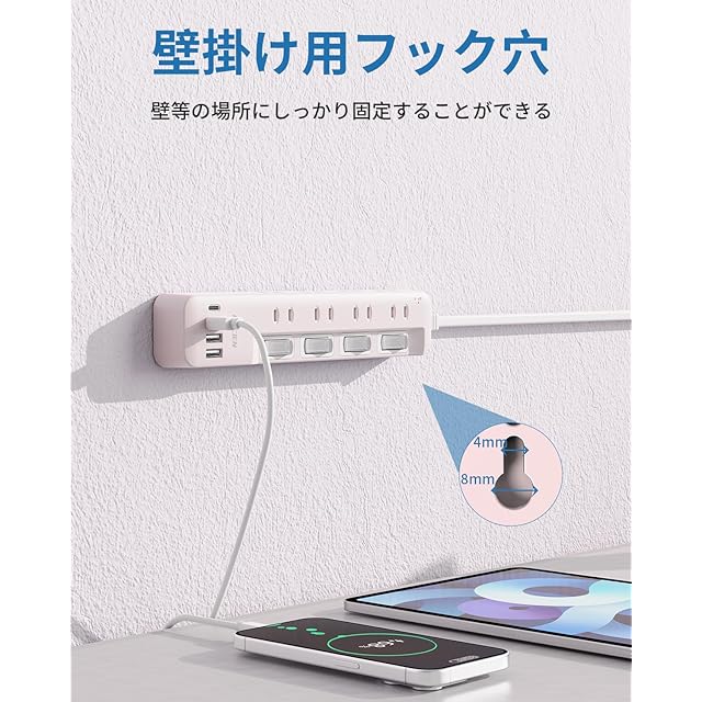 【壁掛けタップ・テーブルタップ】電源タップにはフック穴が付いており、壁等の場所にしっかり固定することができます。テーブルタップの底に滑り止めが付いており、使用がより安定しています。