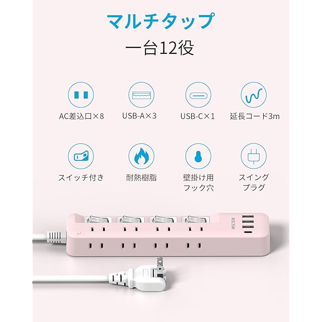 商品名:Mscien 電源タップ usb付き 8個AC口 1個usbc 3個usba 延長コード 3m 雷ガード usb コンセント oa スイッチ付き 壁掛け たこあしコンセント テーブルタップ マルチタップ スイングプラグ おしゃれ ピンク 可愛い