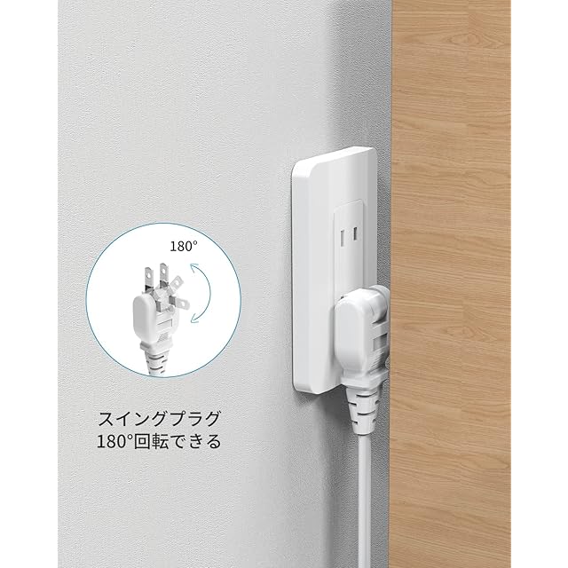 【干渉しない・スイングプラグ】2面にはAC差込口が4口ずつあり、間隔が広めなので、干渉することなくすっきりとしています。スイングプラグは180°回転できるので、狭いスペースでも配線しやすいです。
