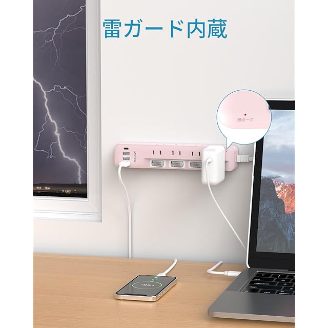【雷ガードタップ・安心】雷ガード機能を搭載しており、雷サージによる接続機器への被害防止に有効です。耐熱性に優れた素材を使用しており、トラッキング・火災の防止に有効です。