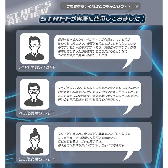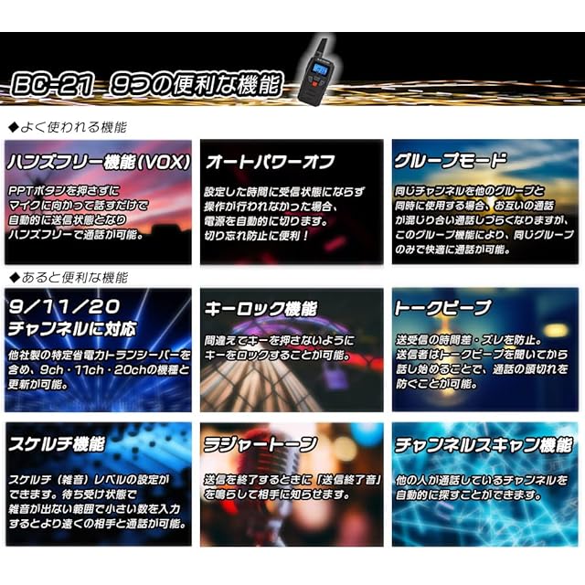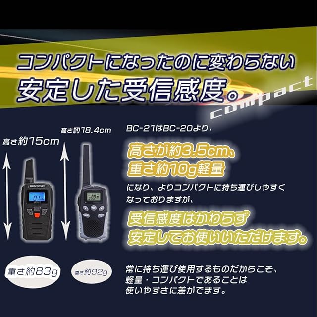 BlueCenturyオリジナルトランシーバー BC-21! トランシーバービギナーからベテランまで幅広くお使い頂いているBC-20の後継機、ついに登場です! 買ってすぐ使えるイヤホンマイク、ベルトクリップも付属! しかも今回は耳掛けイヤホン、PTTマイクもしっかりしたタイプになりそのままで本格的な運用が可能です。 さらに電池は単4電池4本から単3電池3本へ変更! 長時間運用も可能となりました。 コストが抑えられるところは抑えて当店が出来る限りの値段に抑えました。 ■主な特徴 ・ハンズフリー機能(VOX)PTTキーを押さずに、マイクに向かって話すだけで自動的に送信ができます。 話をやめると、自動的に受信待ち受け状態になります。 ・38グループモード機能チャンネル番号とグループ番号を同じ番号にすると仲間同士だけで通話ができます。 ・チャンネルスキャン機能 通話しているチャンネルを自動的に探します。 ・トークビープ機能送受信の時間差・ズレを防止します。特定小電力トランシーバーは規格上発進時頭の声が切れやすいですが送信者はトークビープを聞いてから話し始めることで、通話の頭切れを防ぐことができます。 ・オートパワーオフ機能 何も操作しない状態が設定した時間継続すると自動的に電源が切れます。 電源の切り忘れを防止します。 ・キーロック ・操作音オンオフ ・ラジャートーン ■セット内容 本体/耳掛けイヤホンマイク/ベルトクリップ ※電池は含まれておりません、ご注意ください。 ※当商品に挿せるイヤホンマイクは他社製は使用不可、当商品専用品となります。 ※1台セットの取扱説明書はWebよりダウンロードとなります。