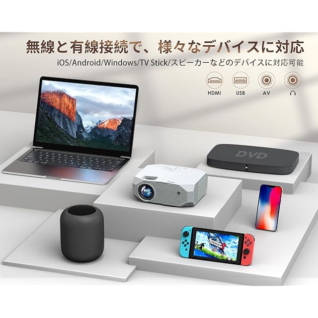 ✨【多彩な互換性・安心】この家庭用プロジェクターはWi-Fi、Bluetooth接続以外に、HDMI、AV、USB端子が搭載しており、ノートパソコン/スマホ/TVボックス/DVDプレーヤー/USBメモリー/Google Chrome cast/X-Box/PS3/PS4など様々な周辺機器に接続できます。Fire TV Stickと接続して、Prime Video、NetflixやYouTubeなどの動画サイトも簡単に接続が出来たので、手軽に利用したい方にはとてもオススメです。ご購入日から2年間のメーカーサポートを提供します。万が一使用中に何かご不明な点や初期不良などがありましたら、お気軽に弊店のサポートまでご連絡していただければ幸いと存じます。すぐに新品交換させていただきます。ご連絡の手順:アカウントサービス内の「アカウントサービス」>「注文履歴」>「注文の詳細」>「販売元」>「質問する」