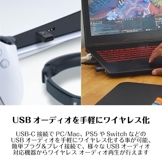 【技適取得済】aptX Adaptive ハイクオリティ モードを搭載、aptX Adaptive 24bit/96kHz対応のBluetoothオーディオ機器と接続してハイレゾ品質のワイヤレス オーディオ再生が可能。USB-C接続でPC/Mac、PS5/PS4やSwitchなどのUSBオーディオを手軽にワイヤレス化する事が可能。 ローレイテンシー モードは、aptX Adaptiveの遅延を最低限に抑え、映像コンテンツの鑑賞やゲーム プレイに適したモードです。