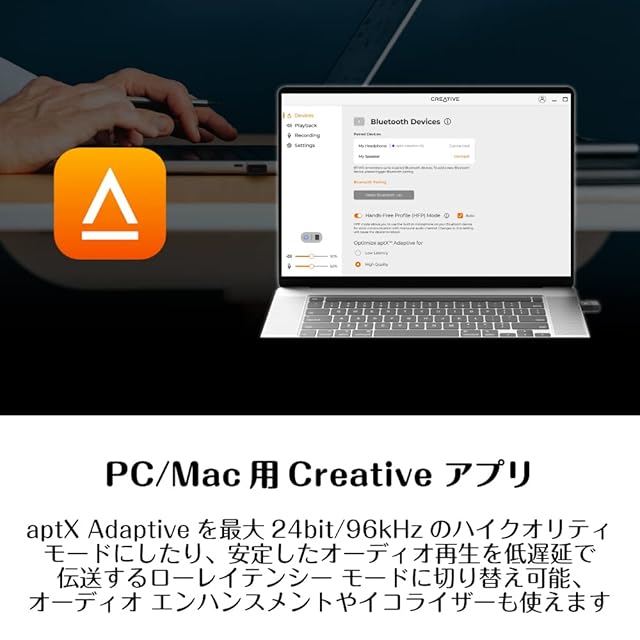 Creativeアプリでは、aptX Adaptiveを最大24bit/96kHzのハイクオリティ モードにしたり、安定したオーディオ再生を低遅延で伝送するローレイテンシー モードに切り替えたりできるほか、Bluetoothオーディオ機器とのペアリング操作や、最大4台まで記憶したBluetooth機器との接続切り替えなども可能
