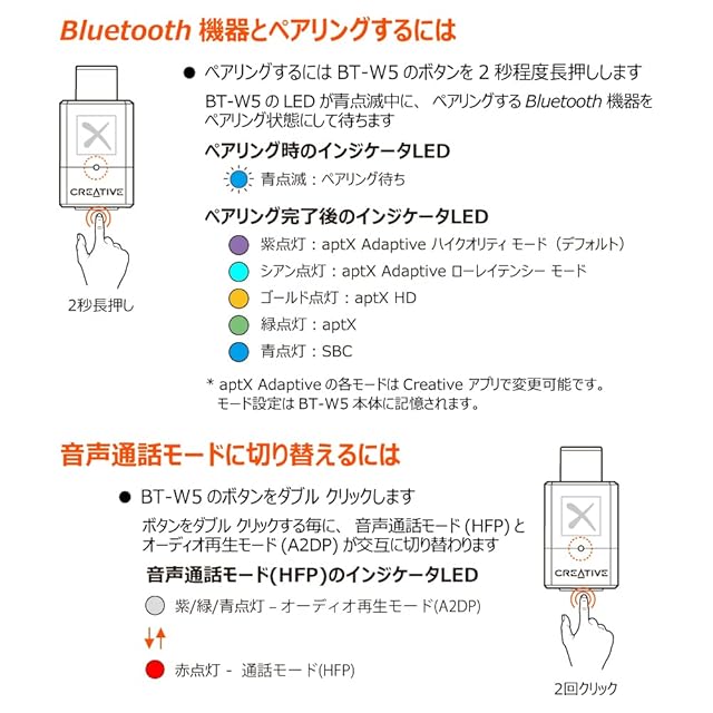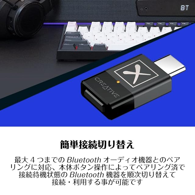 【ご購入前に必ずお読みください】1.BT-W5はiPhone等のスマートホンやiPad、DAPとの動作はしておりません。2.BT-W5はaptX Low Latency / aptX Lossless / HDには対応していません。3.USBハブをご利用の場合は、必ずACアダプタで電源を供給されるタイプをご用意ください。4.周囲のWi-Fiなど無線信号/電波が干渉する可能性があるので、周囲に電子レンジ、コードレス電話などがある・別のBluetooth機器が近くにある場所でのご使用はご注意ください。 注: 本製品のパッケージには、USB C-A変換アダプターとアナログ マイクは含まれていません。【CREATIVE製品は技適マーク取得後販売しています】