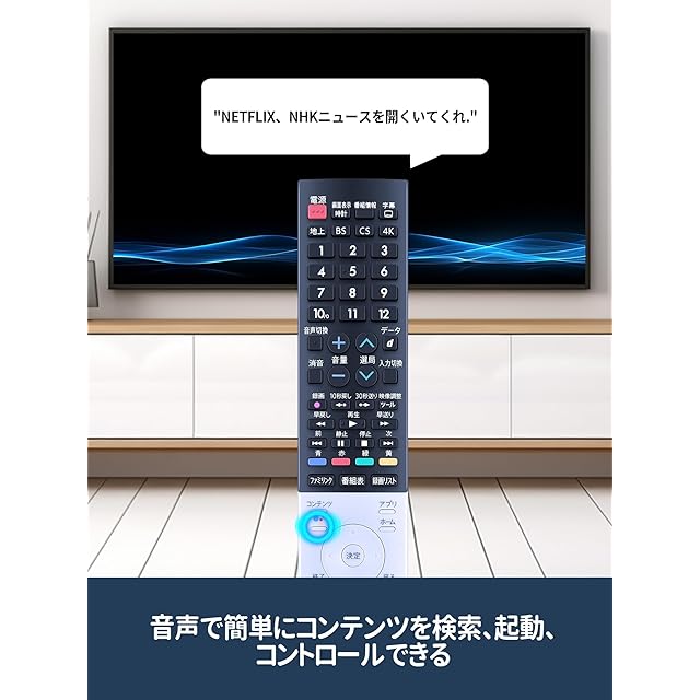 【音声認識機能付き】リモコンは音声検索が可能で、音声認識ボタンを押しながらリモコンに話しかけることで、好きなタイトルの検索や再生を操作することができます。