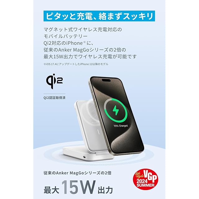 ピタッと充電、絡まずスッキリ:マグネット式ワイヤレス充電対応のモバイルバッテリー。Qi2対応のiPhone等に従来のAnker MagGoシリーズの2倍の最大15W出力でワイヤレス充電が可能です。