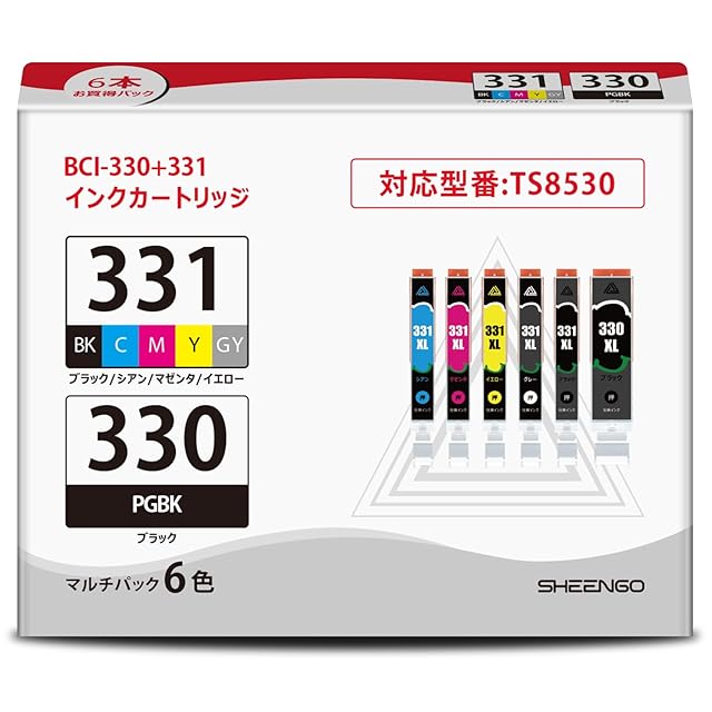 商品名:BCI-331+330/6MP インクカートリッジ キヤノン 用 BCI-331(BK/C/M/Y/GY)+330 6色マルチパック 純正 (大容量)と同量 互換 対応機種:PIXUS TS8530 TS8630 TS8730 TS8830 インク