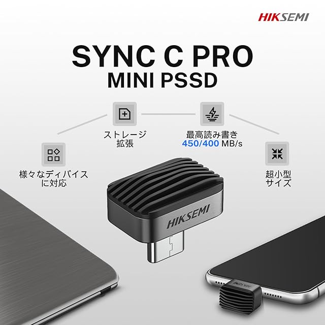 【HIKSEMI史上最小・最軽量の外付けSSD】 HIKSEMI Sync C Proは、わずか約13.5mmの飛び出し幅と2.8gの超軽量設計を実現した、当社最小・最軽量の外付けSSDです。MacBookやiPadに装着したままでも目立たず、持ち運びにも最適。スタイリッシュなダークグレイの筐体は、Apple製品との相性も抜群です。