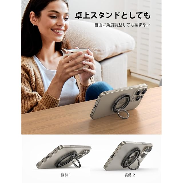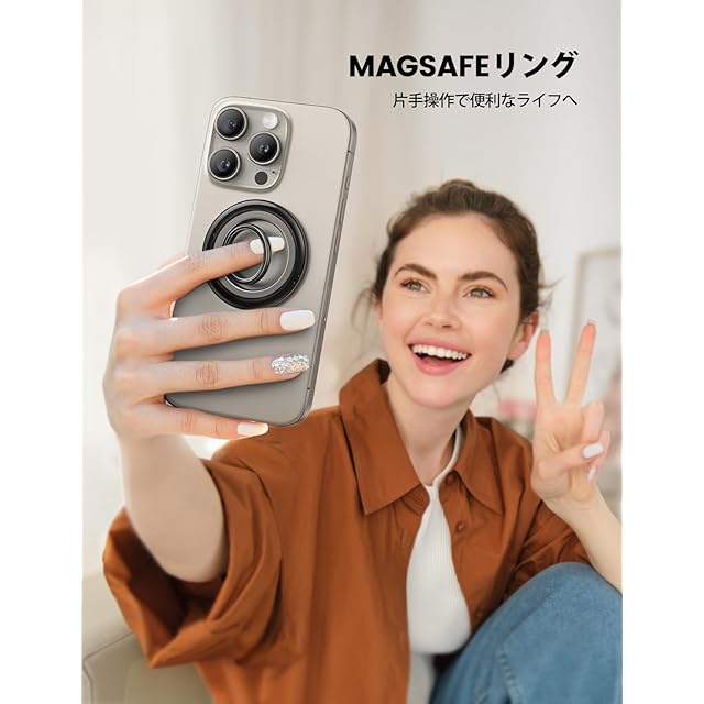 【カチカチ回転音】 Lamicall magsafe対応 スマホリング : マグセーフ バンカーリング 携帯 リング ホルダー iphone リング 機械感360度回転 マグネット 磁石 磁気増強 メタルリング付き 落下防止 iPhone 15 / 14 / 13 / 12 Android に対応 【機械感回転・カチカチ回転音】このmagsafeリングは回転可能な内部リンクが設置され、装着したままでスムーズに360度回転機能を実現します。回転部にギアがセットされており、回転時にカチカチと音が鳴り、回転感も抜群。また、90度反転・360度回転の仕様で、スマホの持ち直しが自由自在。卓上スタンドとしても活躍しています。回転部にギアがセットされており、回転時にカチカチと音が鳴り、回転感も抜群。 【強力磁力でしっかりと吸着】約1000gまでの荷重に耐える強力磁力です。iPhone 15/14/13/12 シリーズをしっかりと吸着できます。マグネット式スマホリングで、iPhone MagSafe シリーズ本体やMagSafe搭載ケースに簡単に装着できます。また、マグネットなので跡を残さず取り外し可能です。テープ跡や糊残りを気にせずお使いのスマホをきれいな状態でご利用いただけます。 【落下防止・片手操作】リングに指を通して持つことで落下防止に役立つ。また、画面に触れる範囲が広くなり、片手操作が楽になります。 【カメラレンズのキズ防止】このマグセーフリングの厚さは5.7mmで、スマホを卓上に水平に置いてもスマホのレンズにぶつからないです。ケースを装着しなくても、スマホレンズに傷がつく心配がありません。 【対応機種】iPhone 2024, iPhone 16 16Plus 16Pro 16Pro Max, iPhone 15 15Plus 15Pro 15Pro Max, iPhone 14, 14pro, 14pro max, 14Plus, iPhone 13, 13 Pro, 13 Pro Max, 13 mini, iphone 12, 12 Pro, 12 Pro Max, 12 miniの本体やMagSafe搭載ケースに直接装着可能です。付属されたメタルリングを利用すると、磁力がもっと強くなります。 【付属のメタルリング貼り付けたら利用できる機種とケース】Samsung Galaxy, LG, Sony Xperia, HUWEI, XiaomiなどのAndroidスマホで、本品は強力な粘着力があるメタルリングが添付されます。AndroidスマホやMagSafe非対応ケースもメタルリングを貼り付けたら、本品を使用できます。マグセーフリングを取り外すだけで、充電できます。メタルリングを利用した場合でも熱くなりませんが、ご安心ください。 【❗❗注意】メタルリングをしっかり貼り付けることを確保するために、24時間後ご使用ください。また、メタルリングを利用する場合は、磁力が強くなります。正面から引き抜くとメタルリングも取り外す恐れがありますので、横から抜いてください。 携帯リング リング スマホ 携帯りんぐホルダー 強力 携帯リングホルダー iphone バンカーリング iphone 13 リング iphone 14 リング magsafe リング スマホリング バンカーリング magsafe スマホリング magsafe マグセーフ リング マグセーフ スマホリング lamicall magsafe スマホリング magsafe バンカーリング スマホリング マグセーフ lamicall magsafe 360度回転式 マホリング マグネット スマホリング スマホリング 磁石 magsafe スマホリング iphone リング magsafe iphone 磁石 リング magsafe対応 リング