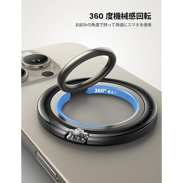 【機械感回転・カチカチ回転音】このmagsafeリングは回転可能な内部リンクが設置され、装着したままでスムーズに360度回転機能を実現します。回転部にギアがセットされており、回転時にカチカチと音が鳴り、回転感も抜群。また、90度反転・360度回転の仕様で、スマホの持ち直しが自由自在。卓上スタンドとしても活躍しています。回転部にギアがセットされており、回転時にカチカチと音が鳴り、回転感も抜群。