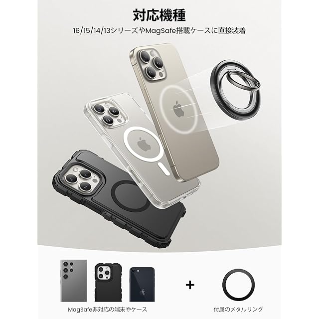 【対応機種】iPhone 2024, iPhone 16 16Plus 16Pro 16Pro Max, iPhone 15 15Plus 15Pro 15Pro Max, iPhone 14, 14pro, 14pro max, 14Plus, iPhone 13, 13 Pro, 13 Pro Max, 13 mini, iphone 12, 12 Pro, 12 Pro Max, 12 miniの本体やMagSafe搭載ケースに直接装着可能です。付属されたメタルリングを利用すると、磁力がもっと強くなります。