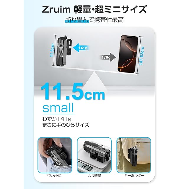 【軽量、ポケットサイズ】Zruimは自撮り棒を使用するシーンを考えて、数え切れないほどの実験の経て、自撮り棒の機能が満たされている状態で更に小型に進化しました。自撮り棒は43cmまで伸縮可能、折り畳んだ状態は11㎝、400mlのペットボトルよりも小さい、薄さは半分ぐらい、ズボンのケットにも入ります。じどり棒の重量は約140g、市販商品と比べると35%軽量化して、持ち運びは非常に便利です!