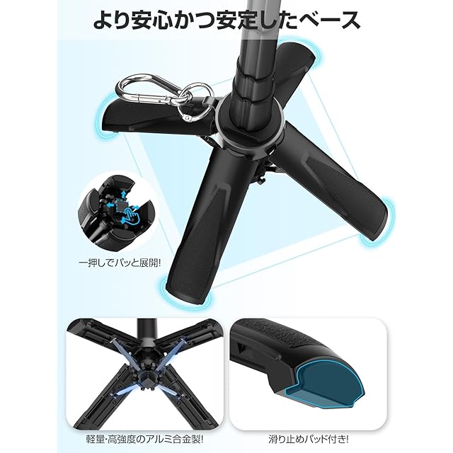 【四脚機能付き!小型のに安定性が劣らない】「自撮り棒だけだとブレるし、不安定…」そんな心配は無用!このセルカ棒は ワンタッチで四脚に早変わり!従来の三脚よりもしっかりとした安定感があり、動画撮影やライブ配信にも最適。さらに、底部には「滑り止めシリコン」を採用し、屋内・屋外どこでも安定した設置が可能。旅行先やカフェ、公園など、どこでも安心して撮影を楽しめます!