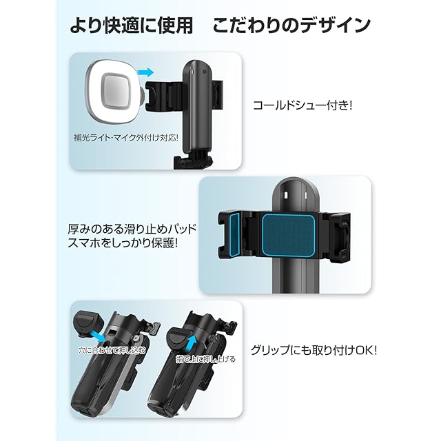 【多機種対応!安心の保護設計】スマホのサイズが合わないかも…と心配?大丈夫!このセルカ棒は 65~93mm のスマホに対応し、ほぼすべての機種で使えます さらに、スマホホルダーには 滑り止めソフトラバー を搭載し、しっかり固定して落下を防止。しかも、「コールドシュー付き」で、外付けマイクや補助ライトも装着OK!6段階伸縮 で、シーンに合わせて自由に長さを調整できます!
