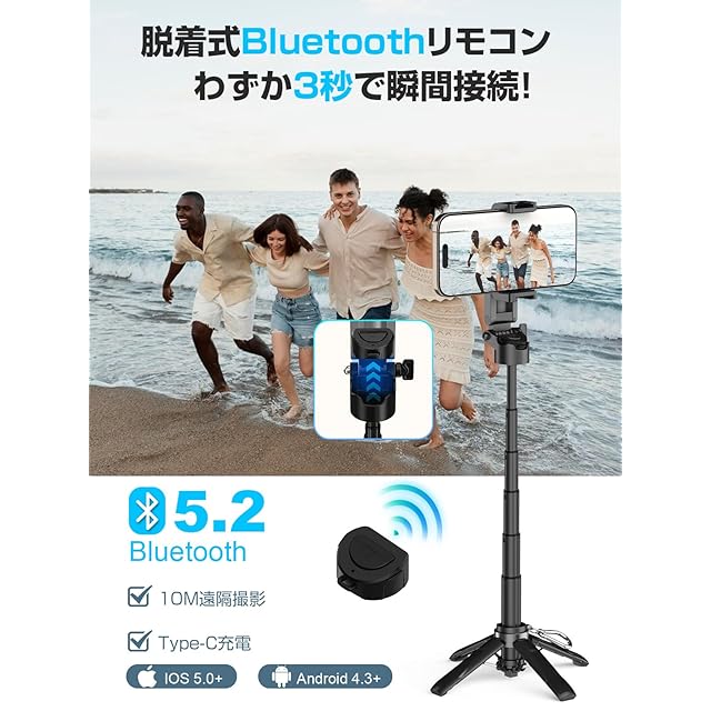 【業界トップBluetooth5.2、瞬間接続】最新の Bluetooth 5.2 搭載で、ワイヤレス接続がさらに安定!リモコンの操作範囲は 最大10m だから、遠くからでも簡単にシャッターが切れます。初心者にも簡単操作できる、初期接続が完了すると、セルカ棒のリモコンは電源をオフにしても設定が残ります。集合写真や動画撮影も、誰かに頼む必要なし!さらに、リモコンは「Type-C充電式」で、10分の充電 で長時間使用OK。iPhone(iOS 5.0以上)&Android(4.3以上)に対応し、幅広いスマホで使えます。