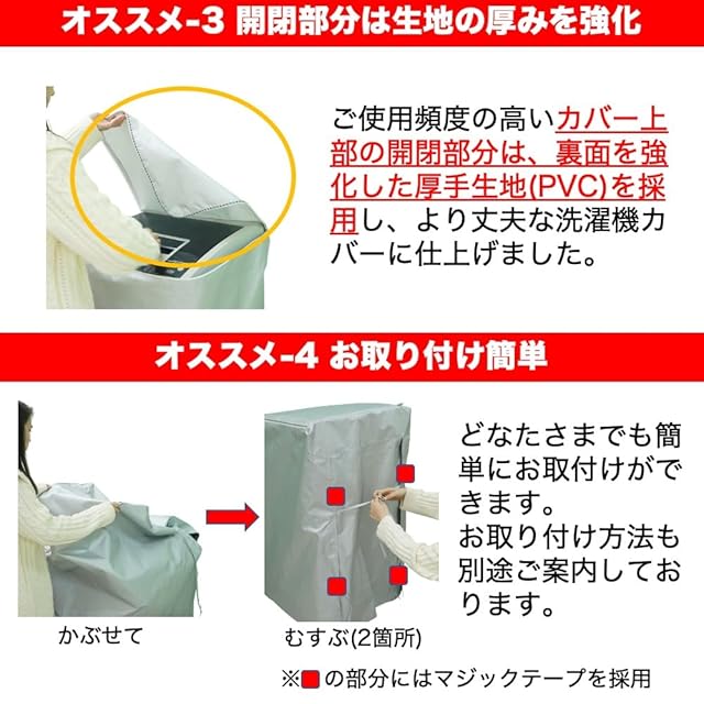 洗濯機カバー上部の開閉部分は、厚手生地(表面:シルバーコーティング/裏面:PVCコーティング)を採用し、より丈夫な洗濯機カバーに仕上げました。